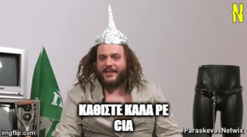 ការពណ៌នាអំពីខ្លឹមសារ: a man wearing a tin foil hat says kaoiste kala pe cia in a foreign language