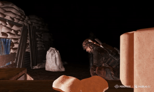 ការពណ៌នាអំពីខ្លឹមសារ: a screenshot of a video game shows a soldier in a dark room with the words minimax and haliuo ai at the bottom