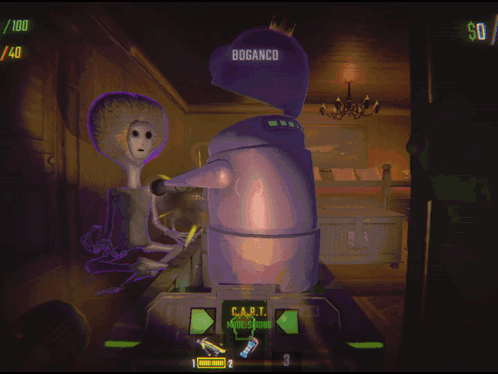 ការពណ៌នាអំពីខ្លឹមសារ: a video game shows a robot with the word boganco on its head