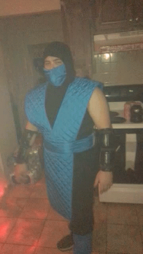 ការពណ៌នាអំពីខ្លឹមសារ: a man in a blue ninja costume is standing in a dark room