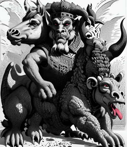 ការពណ៌នាអំពីខ្លឹមសារ: a black and white drawing of a man riding a dragon