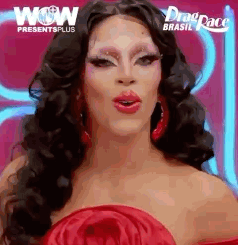 ការពណ៌នាអំពីខ្លឹមសារ: a drag queen is wearing a red dress and red earrings and making a surprised face .