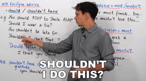 ការពណ៌នាអំពីខ្លឹមសារ: a man stands in front of a white board with the words shouldn 't i do this
