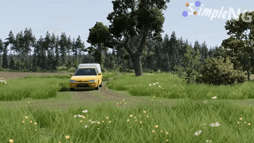 - ការពណ៌នាអំពីខ្លឹមសារ: a yellow car is driving down a dirt road in a field with trees in the background and simplenet written in the corner