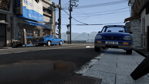 - ការពណ៌នាអំពីខ្លឹមសារ: a blue car is parked on the side of the road in front of a building with a sign on it that says ' a '