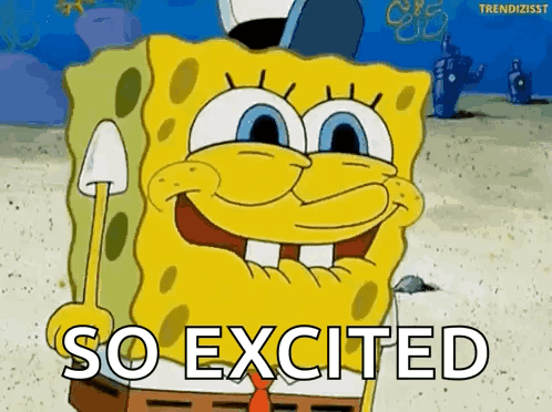 ការពណ៌នាអំពីខ្លឹមសារ: spongebob squarepants is smiling and holding a shovel and the words `` so excited '' below him .