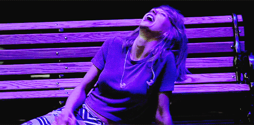 ការពណ៌នាអំពីខ្លឹមសារ: a woman in a purple shirt is laughing while sitting on a wooden bench