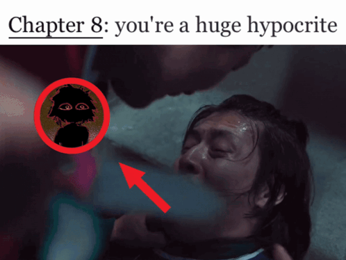 ការពណ៌នាអំពីខ្លឹមសារ: a picture of a man with the caption chapter 8 you 're a huge hypocrite with an arrow pointing to it