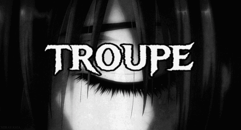 ការពណ៌នាអំពីខ្លឹមសារ: a black and white photo of a woman 's eye with the word troupe in white letters