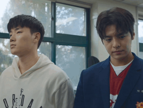 ការពណ៌នាអំពីខ្លឹមសារ: two young men standing next to each other with one wearing a white hoodie that says jordan