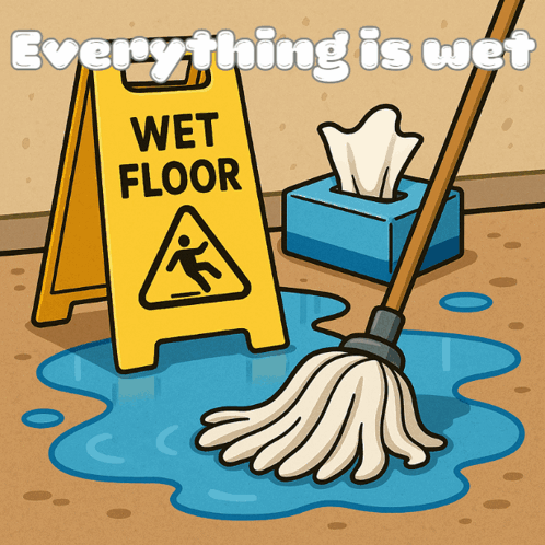ការពណ៌នាអំពីខ្លឹមសារ: a wet floor sign with a mop and a box of tissues