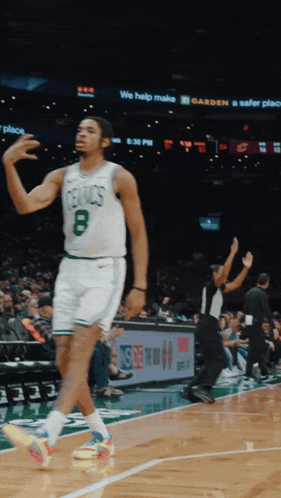 ការពណ៌នាអំពីខ្លឹមសារ: a basketball player with the number 8 on his jersey is walking on the court