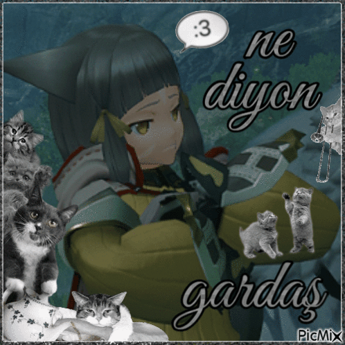 ការពណ៌នាអំពីខ្លឹមសារ: a picture of a girl surrounded by cats with the words ne diyor gardas