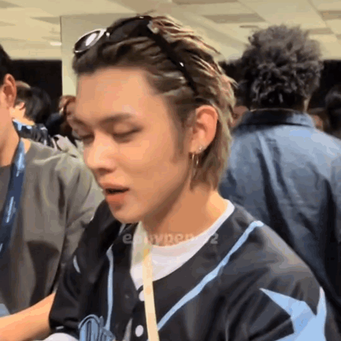 ការពណ៌នាអំពីខ្លឹមសារ: a young man wearing sunglasses and a baseball jersey is sitting in a crowd .