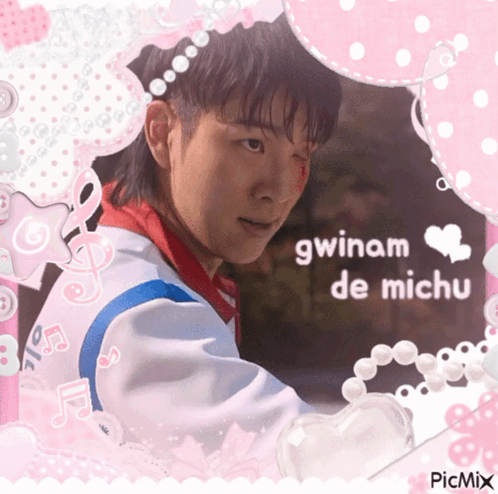 ការពណ៌នាអំពីខ្លឹមសារ: a picture of a man with gwinam de michu written in white on a pink background