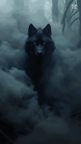 ការពណ៌នាអំពីខ្លឹមសារ: a black wolf in a foggy forest with the letter w on the bottom