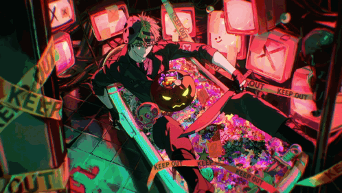 ಕಂಟೆಂಟ್ ವಿವರಣೆ: a colorful drawing of a man holding a pumpkin with a keep out tape surrounding him