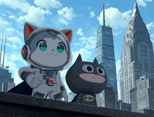 ಕಂಟೆಂಟ್ ವಿವರಣೆ: a cartoon cat and a batman are standing next to each other in front of a city skyline