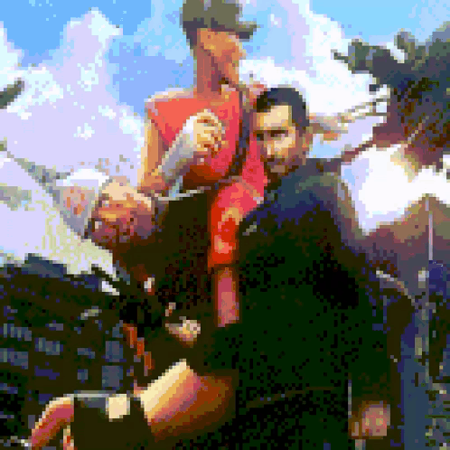 Опис на содржините: a pixel art painting of a man carrying another man on his back .