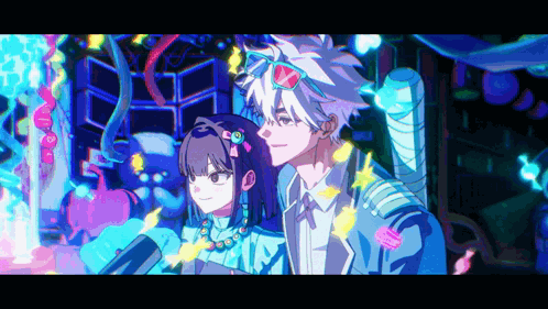 - ഉള്ളടക്കത്തിന്റെ വിവരണം: a boy and a girl are standing next to each other in front of a neon background .