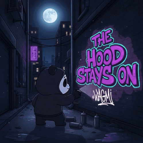 ഉള്ളടക്കത്തിന്റെ വിവരണം: a cartoon drawing of a bear spray painting the words " the hood stays on "