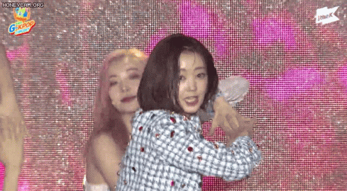 အကြောင်းအရာ ဖော်ပြချက်: two women are dancing in front of a screen that says gkpop