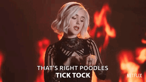 सामग्रीको वर्णन: a woman is standing in front of a fire and says `` that 's right poodles , tick tock '' .