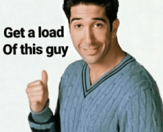 ਸਮੱਗਰੀ ਦਾ ਵਰਣਨ: a man in a blue sweater giving a thumbs up with the words get a load of this guy behind him