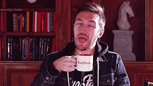 ਸਮੱਗਰੀ ਦਾ ਵਰਣਨ: a man drinking from a buzzfeed mug with his mouth open