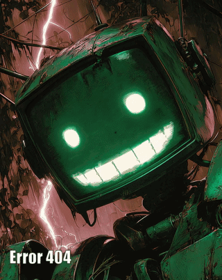 Opis sadržaja: a green robot with a smiling face and error 404 on the bottom right