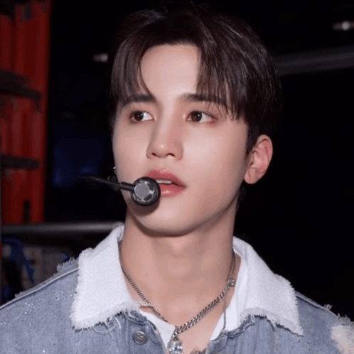 Maelezo ya Maudhui: a young man wearing a denim jacket and a necklace holds a microphone in his mouth