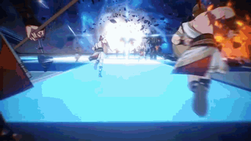 - Maelezo ya Maudhui: a group of people are standing on a blue surface in front of a large explosion .