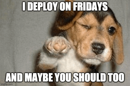 Maelezo ya Maudhui: a beagle puppy with its eyes closed and its paws up with the caption `` i deploy on fridays and maybe you should too ''
