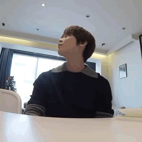 Maelezo ya Maudhui: a man in a black shirt sits at a table in a living room