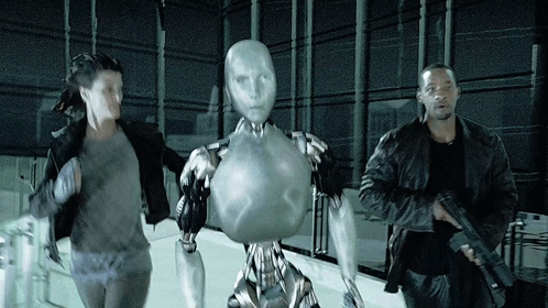 Maelezo ya Maudhui: a man holding a gun stands next to a woman and a silver robot