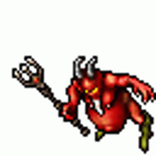 Maelezo ya Maudhui: a pixel art illustration of a devil with horns holding a spear .