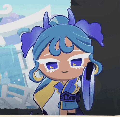 Maelezo ya Maudhui: a cartoon character with blue hair and a fan