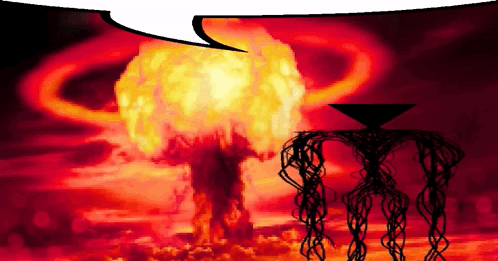 Maelezo ya Maudhui: a drawing of a nuclear explosion with a speech bubble