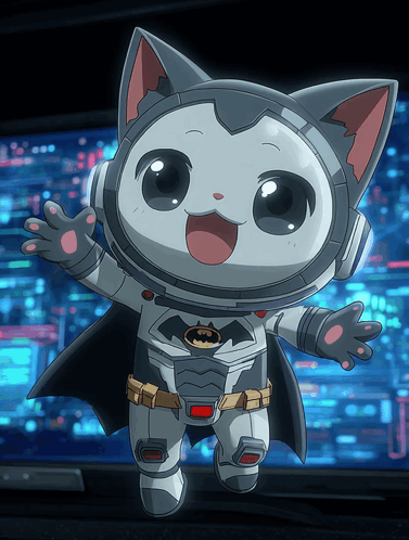 Maelezo ya Maudhui: a cartoon cat in a batman costume