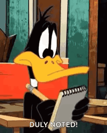 కంటెంట్ వివరణ: daffy duck is sitting at a table holding a notebook and a pen .