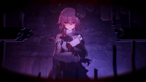 Mô tả nội dung: a girl with red eyes and purple hair is standing in a dark room