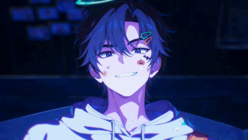Mô tả nội dung: a blue haired anime character with a tattoo on his face