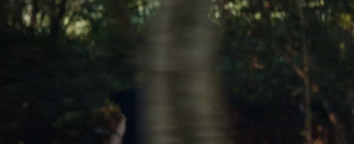 Mô tả nội dung: a woman in a black dress is walking through a forest