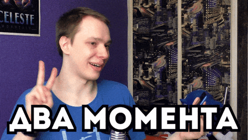Content Description: a man giving a peace sign in front of a poster that says celeste on it