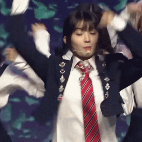 Content Description: a woman in a school uniform and tie is dancing on stage .