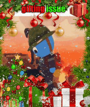- Content Description: a blue teddy bear wearing a hat is surrounded by christmas presents and the words gifting issue above it
