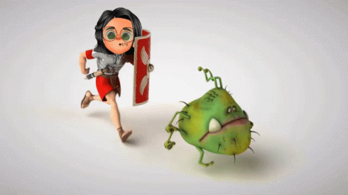 Content Description: a cartoon character is holding a shield and sword while fighting a green monster