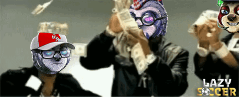 Content Description: a sloth wearing glasses and a red hat holds a pile of money