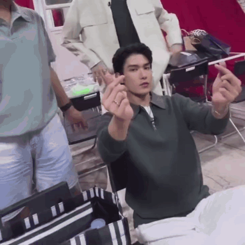 Content Description: a man in a green shirt is making a heart shape with his fingers