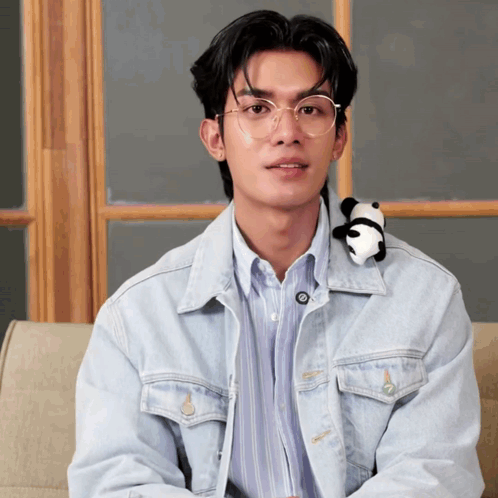 Content Description: a young man wearing glasses and a denim jacket has a stuffed panda bear on his shoulder